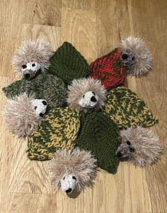 This tiny hedgehog is the perfect size for a child’s finger and has a cosy leafy home in which to play hide and seek (or sleep in, when not playing!). Hedgehog finger-puppet is knitted in minutes in one easy piece, using odds and ends of leftover eyelash yarn / DK yarn. Leafy hidey-hole is also quickly knitted, using double strands of DK yarn – you can make a variegated Autumn leaf mixing two colours (as I have) or a plain green leaf. Straight needles are used for all.