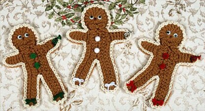 Our cute crochet gingerbread men coasters will delight young and old alike. Trimmed with pompom "buttons", yarn bow ties and "iced" with a sl st; they'll provide protection and decoration all in one! Dress up the house for the holidays and protect your furniture!