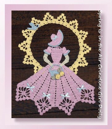Spring is in the air with our beautiful crochet Easter crinoline decked out in pretty pastels. Standing with the sun's rays beaming around, she holds a dainty basket with roses. Embellished with ribbon and a small crochet bluebird! Perfect for spring, for mom, or for Easter.