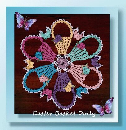 Work up our fun and pretty basket doily pattern for Easter, Mother's Day, or for spring. Six lovely crochet baskets are worked with dainty three-dimensional butterflies between that encircle a delicate rose doily center. Bright flowers spill out of the basket tops creating a masterpiece!