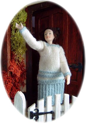 Approximate finished sizes: Jumper - 1½-inches/4 cm wide at chest, height – 2¼-inches/5.5 cm, sleeve length 1¾-inches/4.5 cm, sleeve seam 1½-inches/3.5 cm. This is designed to be long and loose fitting, as was the fashion of the day. Skirt - 1½-inches/4 cm wide at base, 1-inch/2.5 cm wide at waist, 2½-inches/6 cm from waist to hemline.
