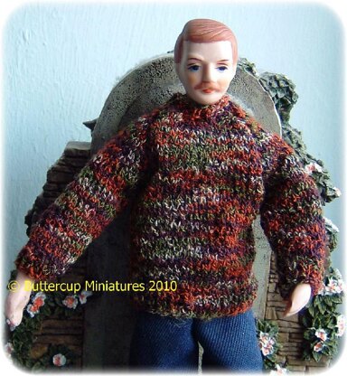 This sweater has been designed to be knitted for a 1:12th scale dolls house doll in either 1-ply wool or some slightly thicker 1-1½-ply yarns such as fine boucle yarn.