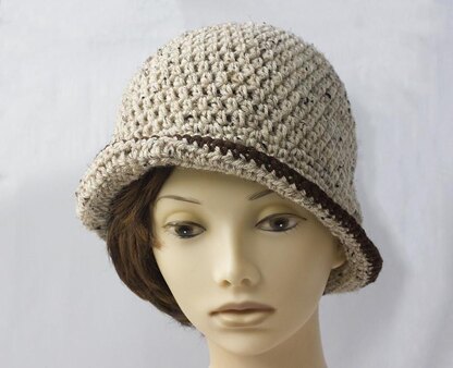 A pretty cloche hat with a brim that is deeper one side than the other, 1920's flapper style.