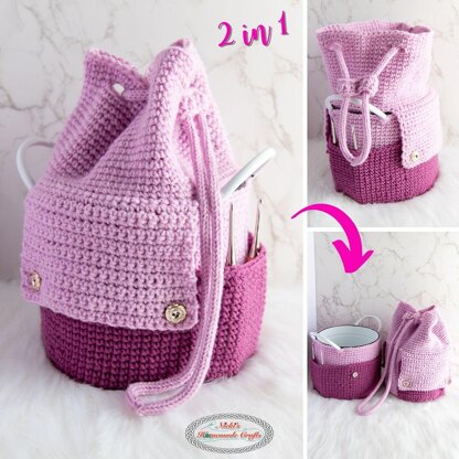 Learn how to make a crochet storage bucket for yarn with this crochet pattern. This storage bag features pockets all the way around for additional crochet hook storage.