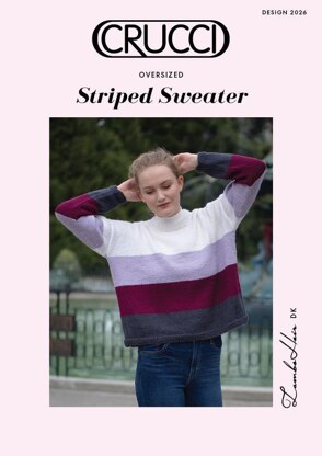 Pattern 2026 is for a women's Lambshair oversized striped sweater. This pattern uses CRUCCI Lambshair 8ply Wool. Easy skill level. Comes in sizes S-XL.