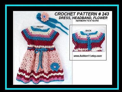 CROCHET PATTERN - Baby Girls Dress and Headband - Newborn to 6 years - Peaches & Cream dress pattern # 243, includes dress, headband, flower patterns.