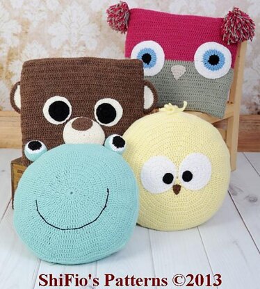 Sizes 2: 18" round, 16" x 16" square UK Materials: UK Aran, Aus 10ply yarn Owl - 130g of pink, 130g green, 50g white, 30g blue, 20g black, 10 medium buttons Chick - 180g of lemon, 10" (25cm) zip, 30g white, 10g black, 5g brown, Bear - 260g of brown, 60g cream, 35g black, 10 medium wood buttons, small amount of fibre fill Frog - 180g of green, 10" (25cm) zip, 10g white, 20g black, small amount of fibre fill USA Materials: USA worsted (4) Owl - 4.5ozs of pink, 4.5ozs green, 1.7ozs white, 1oz blue, 0.7ozs black, 10 medium buttons Chick - 6.3ozs of lemon, 10" (25cm) zip, 1ozs white, 0.3ozs black, 0.1ozs brown, Bear - 9ozs of brown, 2ozs cream, 1ozs black, 10 medium wood buttons, small amount of fibre fill Frog - 6.3ozs of green, 10" (25cm) zip, 0.3ozs white, 0.7ozs black, small amount of fibre fill Materials:H/5mm crochet hook