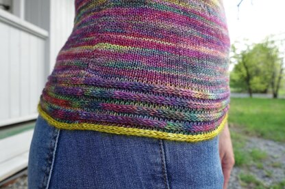 The top is quite short, since it is meant to go with jeans. It is fitted at the waist, and with round neck and short sleeves. There are two rows of i-cords along the neck and sleeves, and five rows on the body. The last i-cord is knitted in a contrast color.