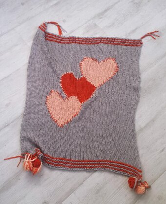 The hearts are worked using the intarsia method (separate the balls into 2 parts to avoid large floats at the back of the work). Pompoms may be added to the bottom corners of the blanket if required.