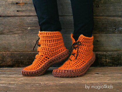 This pattern is written in English, American terminology with STEP-BY-STEP INSTRUCTIONS WITH MANY PHOTOS, VERY DETAILED PHOTO-TUTORIAL AND MATERIALS LIST for making these wonderful slipper-boots that you'll love. SIZES: from 36 up to 44 (EUR)/ from 5.5 up to 11 WOMEN (US) SKILL LEVEL: INTERMEDIATE. Basic skills of crocheting are needed. MATERIALS: •Yarn- any kind of yarn, thickness 4 MEDIUM/ Worsted, Afghan, Aran in 2 colors •Hook – size 5 and 8(EU) or H8 andL 11(US) or any other size to obtain the gauge •Scissors