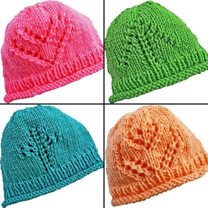 This easy-to-knit child size hat features a simple yarn over motif, repeated 4 times around the circumference. Choose from a Flower, Heart, Cross or Tree. Charts and written instructions are included for all designs.