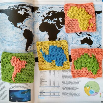 Easy to follow 4 crochet patterns of 10x10cm/4x4" squares with maps of: Africa, South America, Autralia and Antarctica. Use very small amounts of yarn (10g for each square!) to create unique squares, that you can combine with other square motif and make crochet design of your dreams. There's a chart and row by row stitch count for each map.