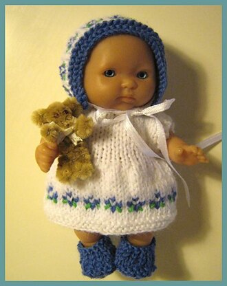 Pattern is written in UK terms but is easy to follow and quick to knit. If you are new to 2 colour knitting patience and care will be required to knit the outfit. Pattern includes dress, bonnet, panties and shoes.