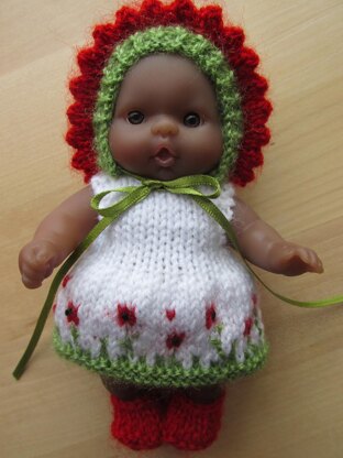 Instructions to make dress with poppy border, lovely bonnet with picot edge, panties and shoes.