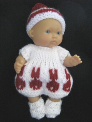 Written in UK terms. Easy to knit. Includes romper suit with rabbit motifs, hat and shoes.