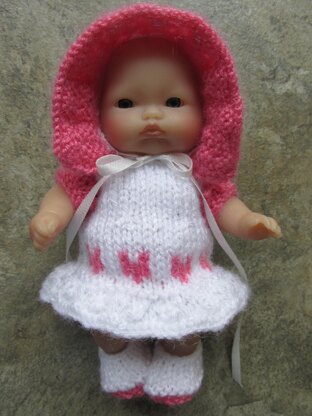Easy to knit and written in UK terms. Instructions are for dress, bonnet, pants and two tone shoes.