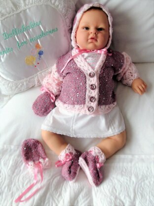 A pretty knitting pattern for a girls cardigan with lace sleeves and border, with a matching bonnet. bootees and mittens. This is a quick and relatively easy knitting pattern in sizes 3lb to 3 months for babies or 15-22" reborn dolls. I have used Sirdar Snuggly DK and Sirdar Soukie DK to knit this version