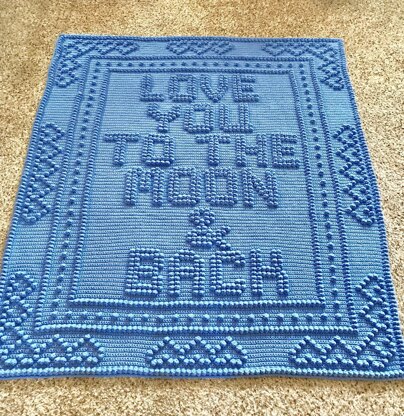 Blanket reads LOVE YOU TO THE MOON & BACK. This is a one piece, no sew blanket, made w/ Caron One Pound & G hook. Finished size is 48 x 55. Yarn choice, hook size and tension may alter finished size.