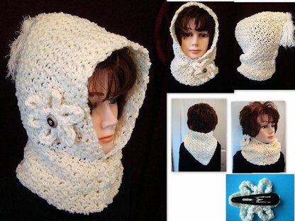 INCLUDED IN THE PATTERN: Instructions for a pullover hood Instructions for a button-up hood Instructions for crochet flower Instructiions for making a tassel