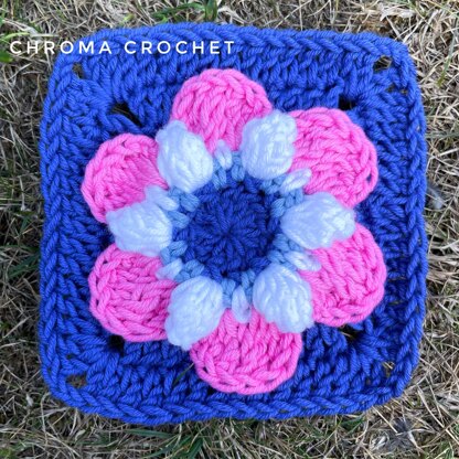 Hello! I hope you love my 60s inspired pop flower square. It’s small being 11cm x 11cm but you can keep adding rows to make it as big as you like.