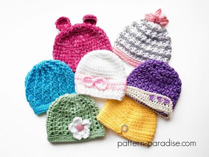 There’s nothing cuter than a newborn in a sweet hat. This collection of 7 hats is designed to give the little lady a new hat every day. Each hat is unique and sized to fit newborn to 3 months.