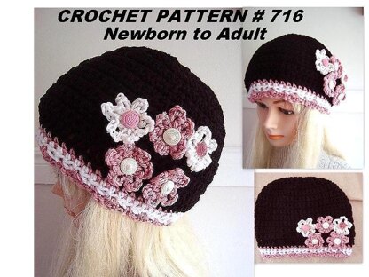 HAT PATTERN - Crochet Pattern -"Penelope" Beanie Hat - flower pattern - newborn to adult - #716 pdf digital download craft supplies An easy pattern from https://www.etsy.com/shop/HatAndScarfPatterns a division of http://www.etsy.com/shop/Hectanooga