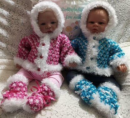 A really cute hooded jacket with matching bootees in a "Jack and Jill Frost" theme. The jacket and bootees are knitted with chunky yarn, but cuffs, welts and borders are knitted with dk eyelash yarn. Due to the mix of yarn thicknesses, this pattern is only in 0-3 month size . It is also a generously sized set to allow for thicker clothes to be worn underneath.
