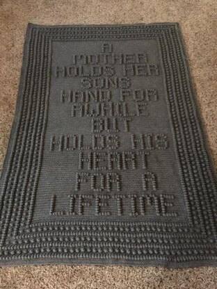 My newest pattern.... SON. Blanket reads A MOTHER HOLDS HER SONS HAND FOR AWHILE BUT HOLDS HIS HEART FOR A LIFETIME