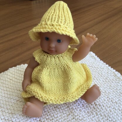 Cute 8" baby doll outfit, frilly knickers, top and sunhat. looks nice in lemon 4 ply cotton but would be cute in any 4ply yarns. I love using up my paintbox yarns for small projects like this one.
