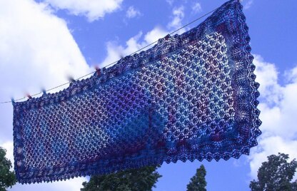 This stole is based on the traditional shawls worn by women in the Shetland isles but with a modern twist. Knitted in one piece, the stole begins with a provisional cast-on from which the centre lace panel is worked flat. Stitches are picked up around for an Old Shale border in the round. Finally, a short provisional cast-on is made and a knitted-on edging is worked. The only "seam" required is the graft between the beginning and end of the knitted-on edging.