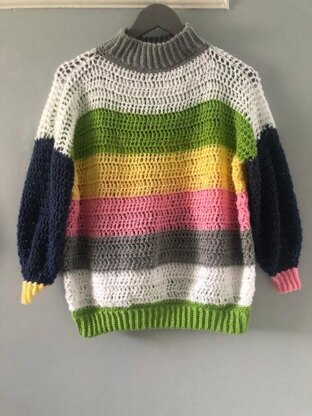 This crochet sweater pattern is for advanced beginners and comes in 5 sizes. Written in US crochet terms you will need to be familiar with the following: double crochet, double crochet two together, chain, slip stitch, single crochet and single crochet back loop only. Available in sizes extra small to extra large. You will need dk yarn (I used Robin DK acrylic) in 6 shades. 7mm and 4mm crochet hooks. Each row has a running stitch count to keep you on the right track.