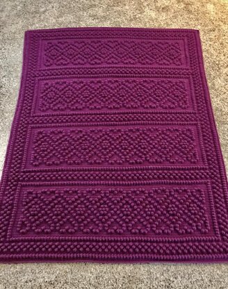 This blanket is made as one piece. No sewing together. It was made with Caron One Pound & G hook. Finished size is 50 x 65.
