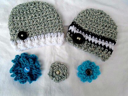 Black Stripe Unisex Beanie Hat - CROCHET PATTERN - All sizes Newborn to Adult, 3 Flower Patterns included, #904