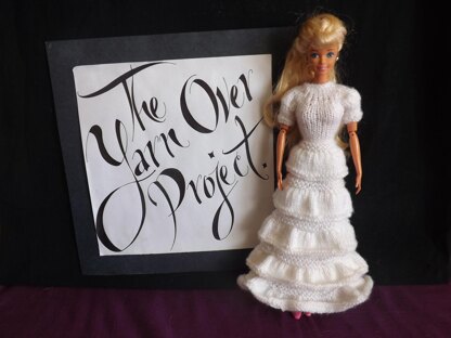 Inspired by Scarlett O'Hara and other 1920's and 30's southern belles, this hand-knit fitted wedding dress features layered flounces and puff sleeves. Modeled by the 1994 Gymnastics Barbie, this dress is made to fit the standard 11.5" high Barbie doll from Mattel. The skirt is knit in the round for a seamless design, while the top is knit back and forth and features a button to allow the dress to slide on easily over Barbie's hips.