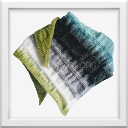 My sample shawl was knit with a “long colour-changing” yarn & 5 mm needles. It measures 140cm x 58cm. For a slightly softer drape, go up a needle size.