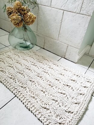 This is a fun, straightforward project for a cotton rug. Coastal theme with its river-like, wave-like pattern. Knits up quickly on large needles. Stitches used include knits, purls and twists.