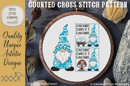 JANUARY - A YEAR OF GNOMES!\nCross Stitch designs by Marcia Manning.\nEach monthly Gnome comes with three designs.\nOne of the Gnome and a wagon, one of the Gnome and a mushroom hut, and one of the Gnome alone.\nThe wagon and hut designs are 92 stitches wide by 92 stitches high.\nThe Gnome by itself will be within 86 stitches wide and high.\nStitch the entire design or just the Gnome!\nPDF is a COLOR counted cross stitch chart which lists suggested DMC floss colors, and includes a color picture.\nStitched design size is as follows:\nSize 11 count: 8.36 x 8.36 inches or 21.24 x 21.24 cm\nSize 14 count: 6.57 x 6.57 inches or 16.69 x 16.69 cm\nSize 16 count: 5.75 x 5.75 inches or 14.61 x 14.61 cm\nSize 18 count: 5.11 x 5.11 inches or 12.98 x 12.98 cm
