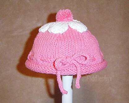 Knit in the round in simple stockinette, the white petals are knit separately and sewn on later to form the flower on top. A length of knitted i-cord is threaded through holes created in the brim and tied to help keep it on tiny heads. A fun pom pom tops it off.