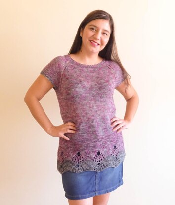 Abloom is a top-down raglan tee knitted in Stockinette st, ended with a lace border. The pattern includes waist shaping and all the instructions are written (no charts).