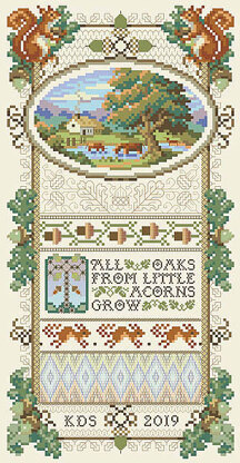 By Sandy Orton. Our classic, original Acorn Sampler is here. With an oval pastoral scene surrounded by acorns, oak leaves, squirrels and a multitude of details, including petite point areas and 15 specialty stitches will surely be an heirloom piece. This coveted and intricate design is back to set the tone for gratitude with this rich autumn sampler and inspirational message. Perfect for the advanced stitcher or one who wants to learn new skills.\n