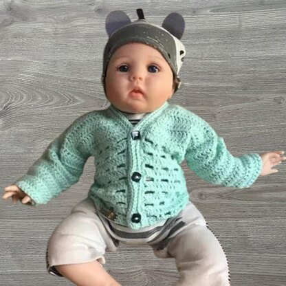 Create a classic V-neck baby cardigan with a lightweight trellis-style texture for a soft breathable finish, worked seamlessly from the bottom up in one piece with no side seams. The sweater is comfortable for everyday wear and special occasions, with a unisex fit for baby boys and girls sized 0–3 months to 2 years.