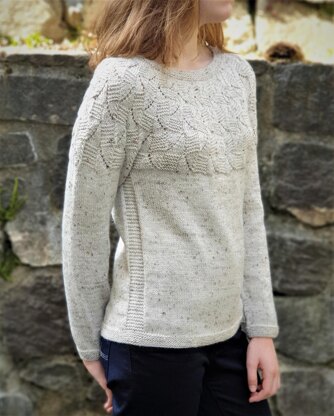 The sweater is worked in one piece top down. You start with 12 rounds of neckband/garter stitch, then work neck shaping with short rows and then continue working in the round. After the round yoke, you separate the sleeves and the body and continue working them separately.
