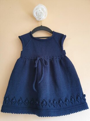 The dress is made for 6-9 months old girl. The measurements are: chest circumference 48 cm, length 40 cm, width at the bottom 88 cm. The dress has positive ease and the size can be adjusted by working more/ less rows. The dress is made top down flat in one piece. It can be worked in the round too and instructions are provided in the pattern.