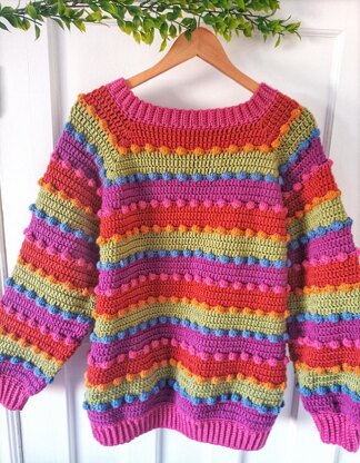 This bobble sweater is made from the top down starting with a sc rib collar then using a simple dc stitch for three rows then a bobble row. It's quick and easy to work up. Then the arm cuffs and edging is made with a sc rib stitch.