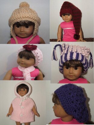 6 different hats for an 18" doll. Easy-intermediate skill levels.