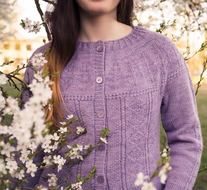 Aire is a cropped cardigan using traditional Gansey elements in a flattering contemporary style. It is a seamless top-down yoke cardigan which is knit flat. There are short rows at the back of the neckline to create a comfortable fit, and then there are pine trees worked in purl stitches around the yoke, followed by a string of bamboo stitching. The remaining yoke, body and sleeves feature zigszags and diamonds created with purl stitches, as well as small cables. There is optional waist and hip shaping, and the hem and cuffs are finished off with ribbing.