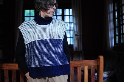The vest is knitted completely seamlessly from top to bottom, and features diagonal shoulders with a slight drop. The sizing is slightly looser than usual.