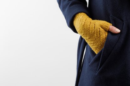 Inspired by the foliage of the Albizia tree, these fingerless gloves create a smooth, gently laced pattern on the top and plain stockinette on the underside.