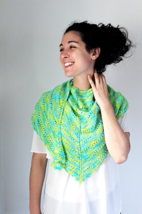 This slightly asymmetrical shawl is a breath of fresh air with its energetic colors: a reflection on a summer morning when the dew is sparkling in the sun, and the greenery glows with an almost neon luminance.