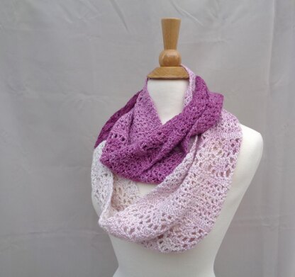 The yarn will flow and fly through your fingers as you work alternating sections of lace and mesh for a nicely balanced texture that compliments the color change in the yarn, yet would look equally well in a solid color.